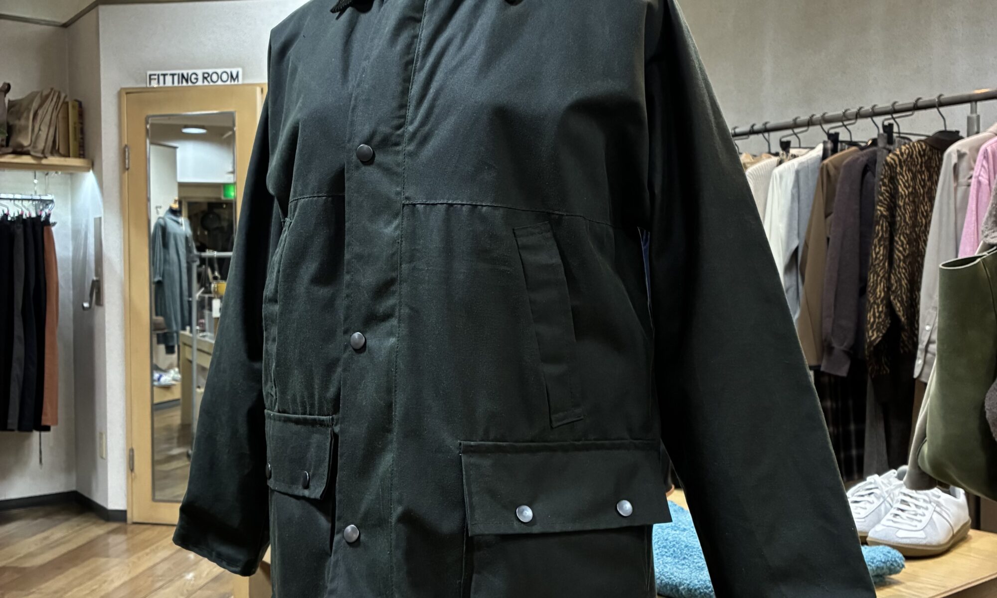 表面にワックスコーティングを施されたジャケットは、独特の光沢感が特徴です。